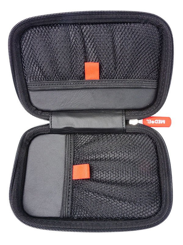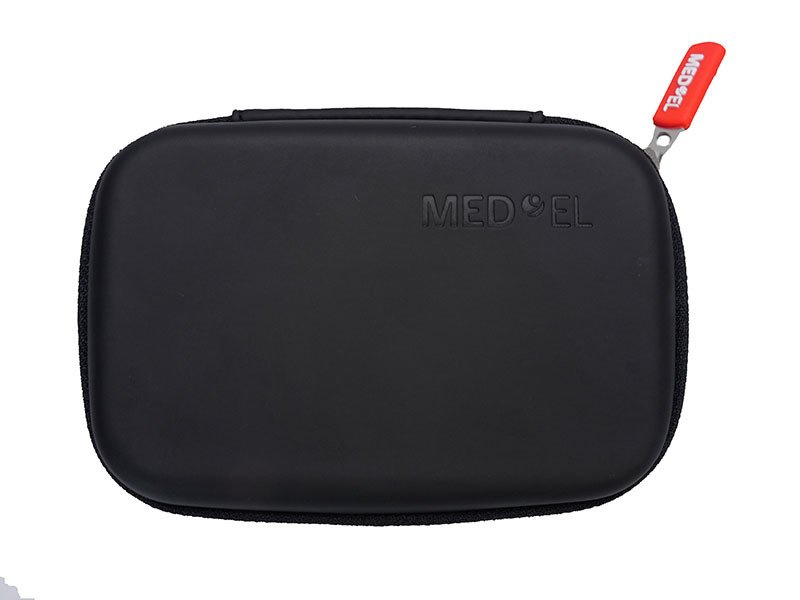 Pudełko zapinane na suwak przeznaczone do przechowywania procesora / procesorów i/lub dodatkowych akcesoriów. Opakowanie z uwagi na swoje bardzo małe gabaryty jest bardzo poręczne. Wymiary pudełka to 13 cm x 9 cm x 3,5 cm. W środku wszyte zostały gumki zapewniające pewne trzymanie procesora i cewki. Pudełko jest sztywne i zapewnia świetną ochronę niezależnie od miejsca gdzie jest przechowywane. Idealnie pasują do niego procesory marki MED-EL, Cochlear oraz Advanced Bionics. W pudełku przechowywać można również piloty marki MED-EL. Kolor czarny.
