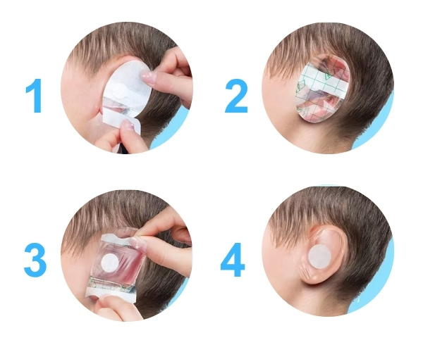 1. Odklej papier zabezpieczający z naklejki – od strony z wacikiem – i przyklej dokładnie do ucha, tak aby wacik znajdował się przy wejściu do kanału słuchowego.