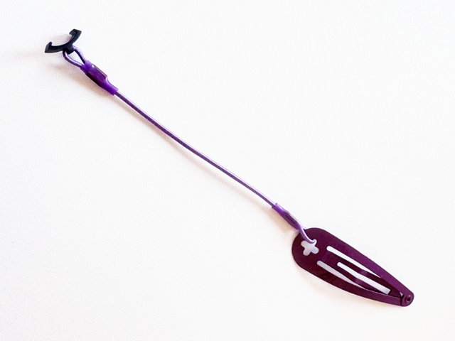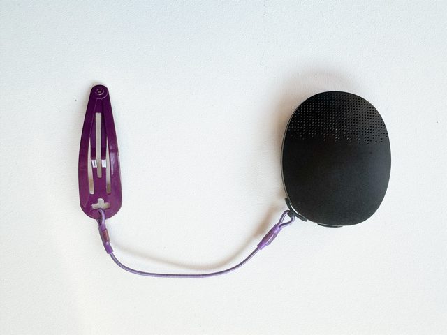 Pojedyncza zawieszka do procesora mowy MED-EL Rondo 3 / Samba 2 wykonana jest z cienkiej elastycznej gumki, metalowej spinki do włosów oraz specjalnego zatrzasku. Spinka ma 5 cm długości i wpięta we włosy mocno się trzyma. Długość linki od spinki do procesora to około 9 cm. Zawieszka w wersji ze spinką będzie dobrym rozwiązaniem dla osób z dłuższymi włosami, w które można swobodnie wpiąć spinkę. Zawieszka jest subtelna i nie rzuca się w oczy.